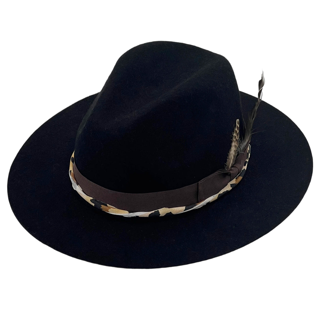Modern Black Hat – Bold Print & Feather Detail