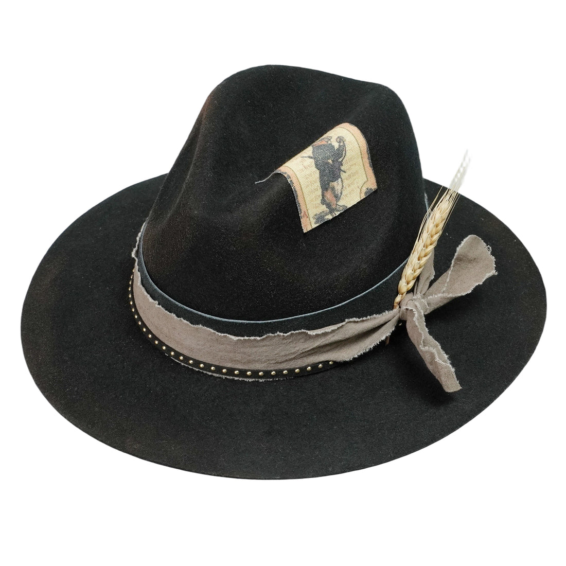 Black Felt Hat – Leather & Fabric Band, Vintage Appliqué