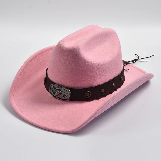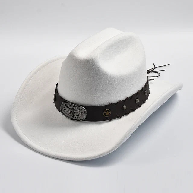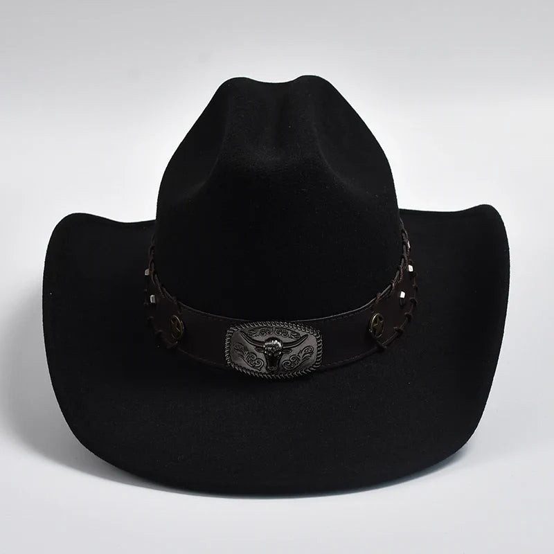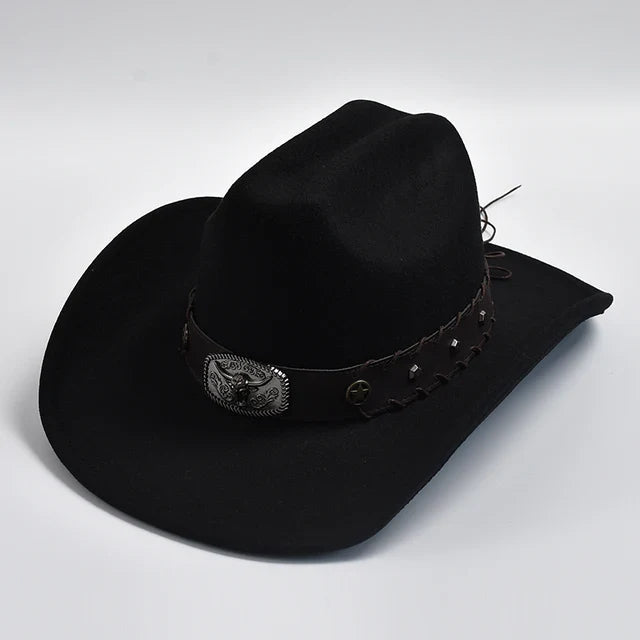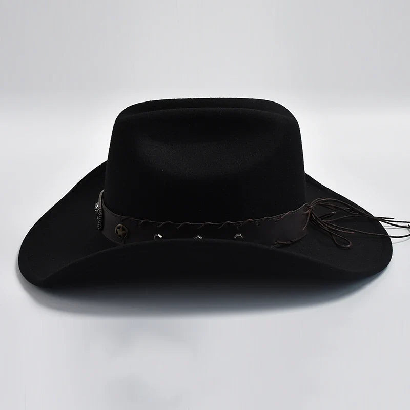 Introducing our New Artificial Wool Western Cowboy Hat, designed for both men and women. Crafted with vintage charm, this hat features a wide brim and a classic fedora silhouette, perfect for gentlemen and ladies alike. Whether you're a cowgirl or a jazz enthusiast, this versatile accessory adds sophistication to any ensemble. Step out in style with this timeless western hat.