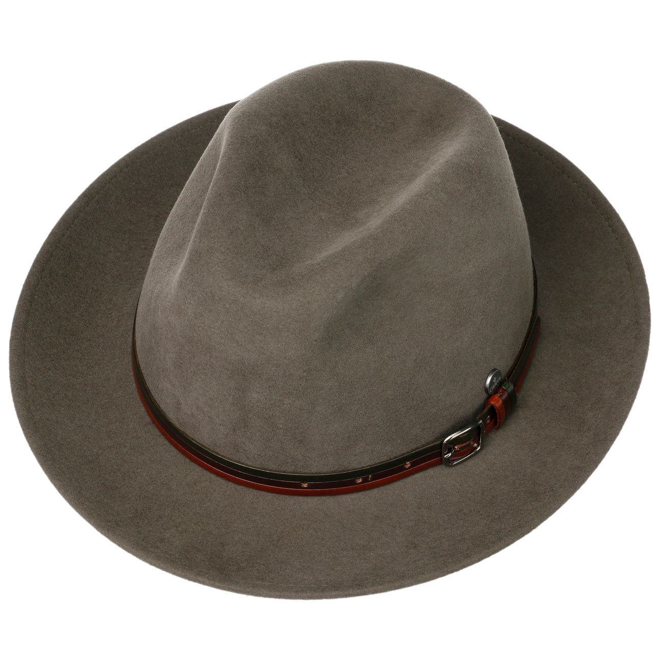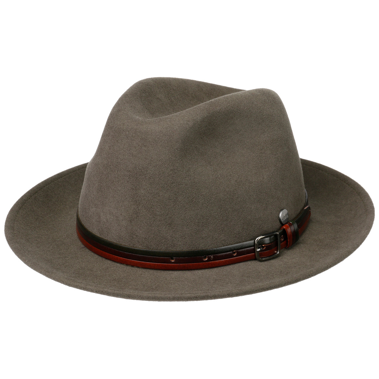 This plain-coloured fedora impresses with its elegant design. It owes its lightweight, warming and water-repellent properties to its 100% felted wool material. The three-coloured leather band with metal buckle adds a distinctive touch to the design. If necessary, this fedora can be rolled up small or crumpled without creasing.