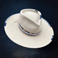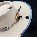 The "City Slicker Fedora in Beige with Feather Blue Patchwork And Band". This stylish fedora features a 4 1/2" crown and a 3 3/4" brim, perfect for adding a touch of sophistication to your look. The hat is adorned with a unique feather blue patchwork and band, giving it a distinctive and eye-catching appeal.