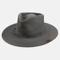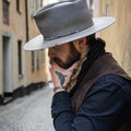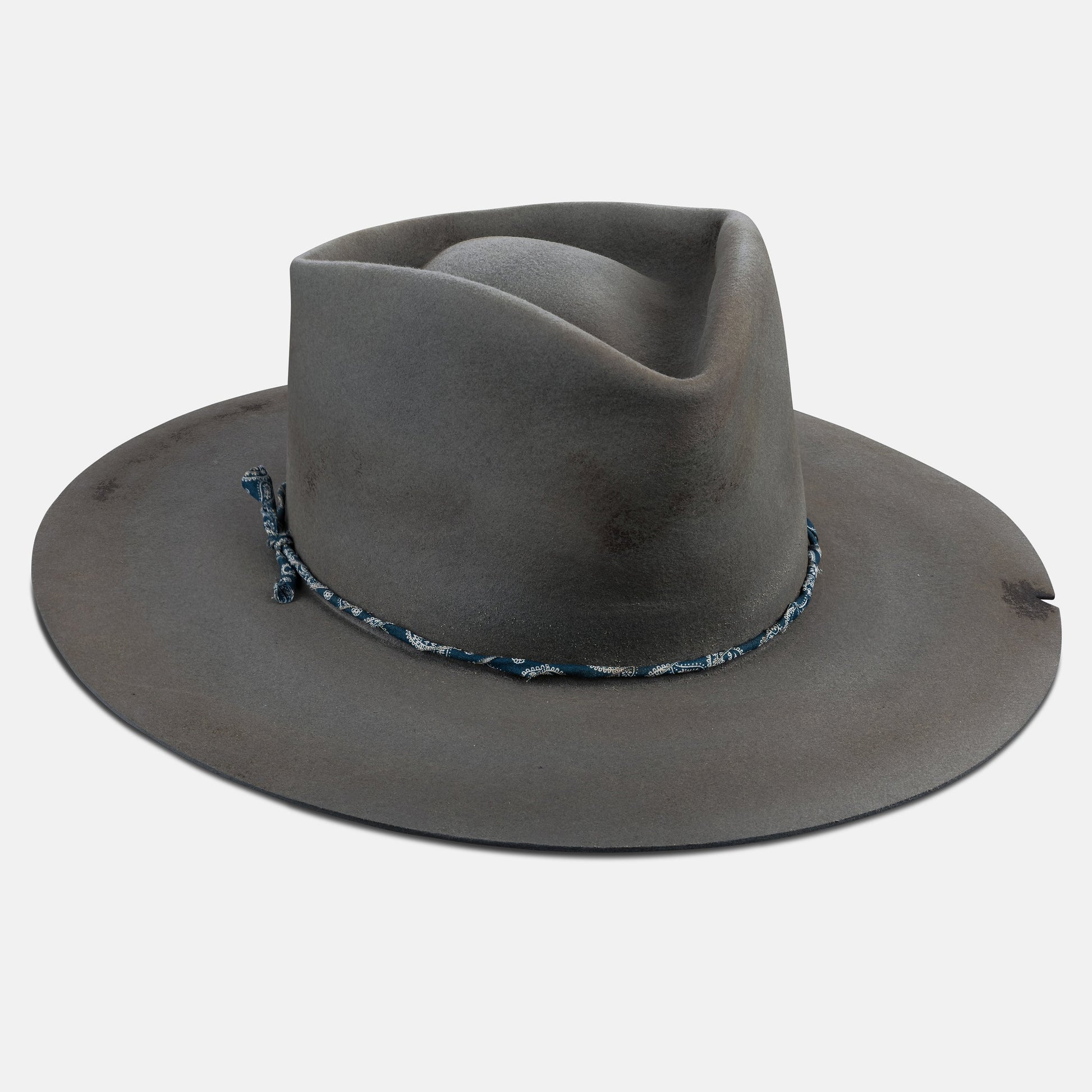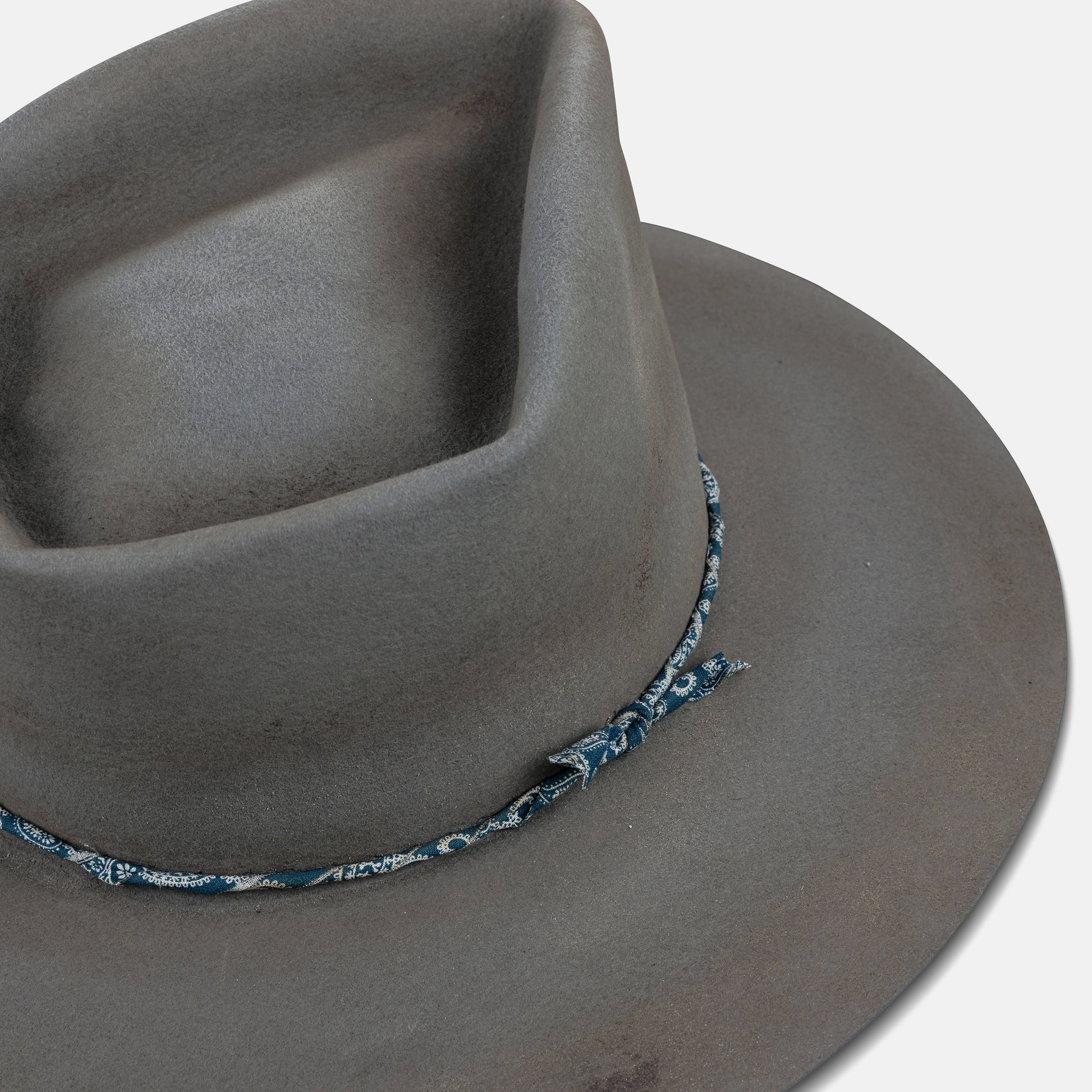 Handcrafted from antiqued light grey felt, and no two are exactly the same. A custom blue and white paisley band wraps around the lower crown serving as the finishing touches to a hat designed for the long haul.