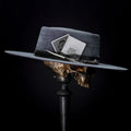 Distressed Fedora with Black Poker Card Insert Featuring Ace of Spades Adorned with Gold Text and Design