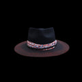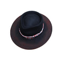 "Distressed Fedora with Red and White Patterned Band" is hand-distressed, hand-dyed, and hand-torched, ensuring no two share the same color or design. Each piece is uniquely imperfect, with subtle variations from product images.