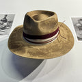 "Distressed Fedora with Red Striped Edge " is hand-distressed, hand-dyed, and hand-torched, ensuring no two share the same color or design. Each piece is uniquely imperfect, with subtle variations from product images.