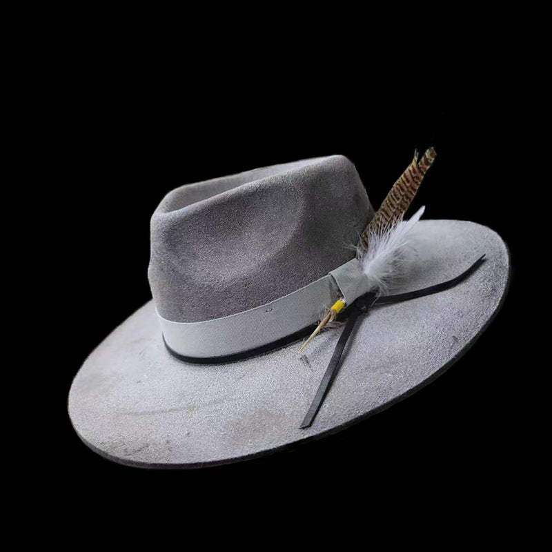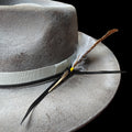 Distressed Fedora with Smoke Grey White Ribbon and Feather
