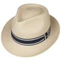 Panama straw is the summery material of choice for this trilby and has been carefully woven using traditional handcrafting methods. The straw hat with a characteristically shaped crown and brim feels airy and lightweight atop the head and flatters the wearer with its plain-coloured design. This is complemented by a stylish, colourfully striped grosgrain ribbon trim with brand pin, which adds the visual finishing touch.