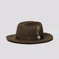 The Fedora is constructed of firm finish, fur felt and features a pinchfront crown, bound edge brim, interior cotton sweatband and grosgrain hat band with feather accent.
