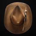 This Tennessee Teardrop European Hare in Whiskey has a sharp cowboy curl. Wrapped in black paisley fabric and an embossed black leather strap with silver buckle. Finished with a silver horseshoe and large feather detail.