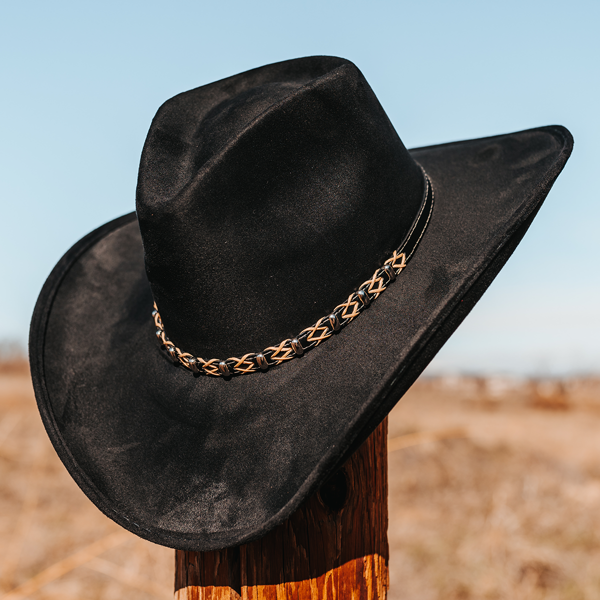 Inspired by Western aesthetics, the JONES hat combines classic style with modern flair. The upturned wide brim and teardrop crown exude a timeless charm, while the braided leather band adds texture and visual interest. Crafted from faux suede and made in Mexico, this hat features a 3 ⅞" brim and fits comfortably with a 23 ¾” circumference. Designed with an inner elastic sweatband, it offers a versatile fit that will accommodate most head sizes. Pay homage to Western heritage with the versatile and stylish JONES hat.