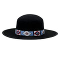 A refined flat-brim, round-crown felt hat in deep black, blending architectural structure with quiet sophistication. The hatband is accented with a distinctive handwoven strap—adding subtle texture and artisanal character to an otherwise minimalist silhouette. The crown stands approximately 4" tall, with a 3½" brim—hand-measured, with a possible variance of up to ¾" (1–2 cm). Designed for urban elegance, editorial wear, or confident everyday style.