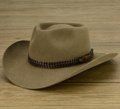 The Snowy River is a pre-creased stockman's hat from Akubra, a classic Australian outback hat. It has a pinched telescope crown and a brim with rolled sides with front and back turned down. This enduring outback style may be worn over the eyes or well back on the head in typical Australian fashion. The crown is 4 inches high. The brim is 3¼ inches wide, with a raw edge. The pure fur felt is Akubra's Imperial Quality. The hat is fully lined and has a bonded leather ornamental band. Reeded roan leather sweatband. UPF rating 50+. Made in Australia.