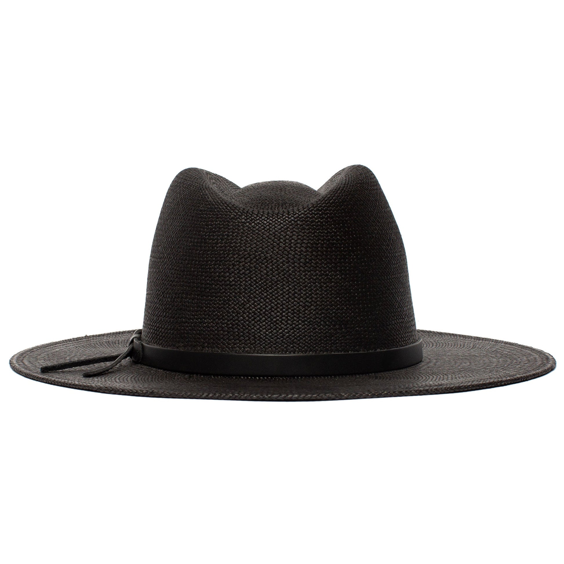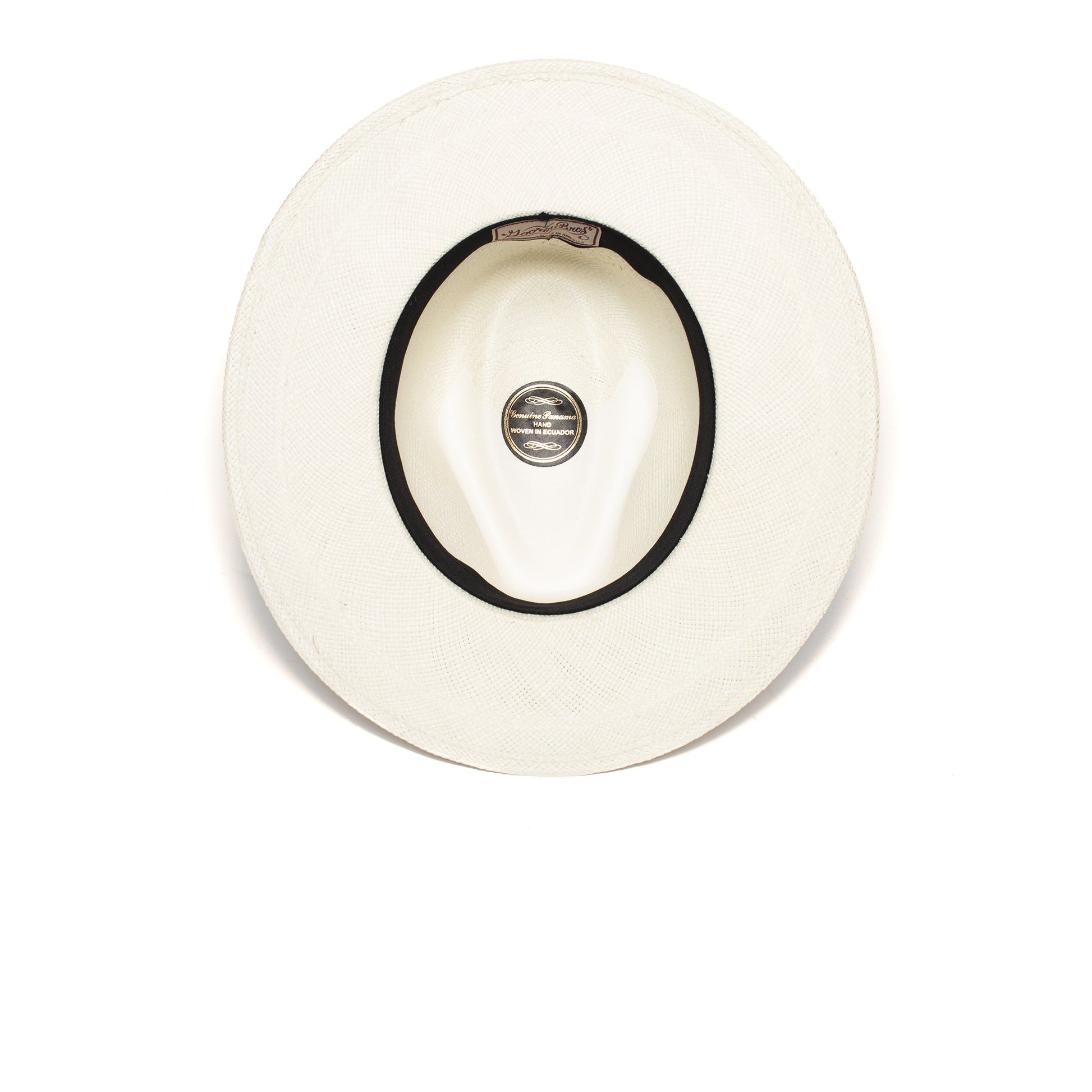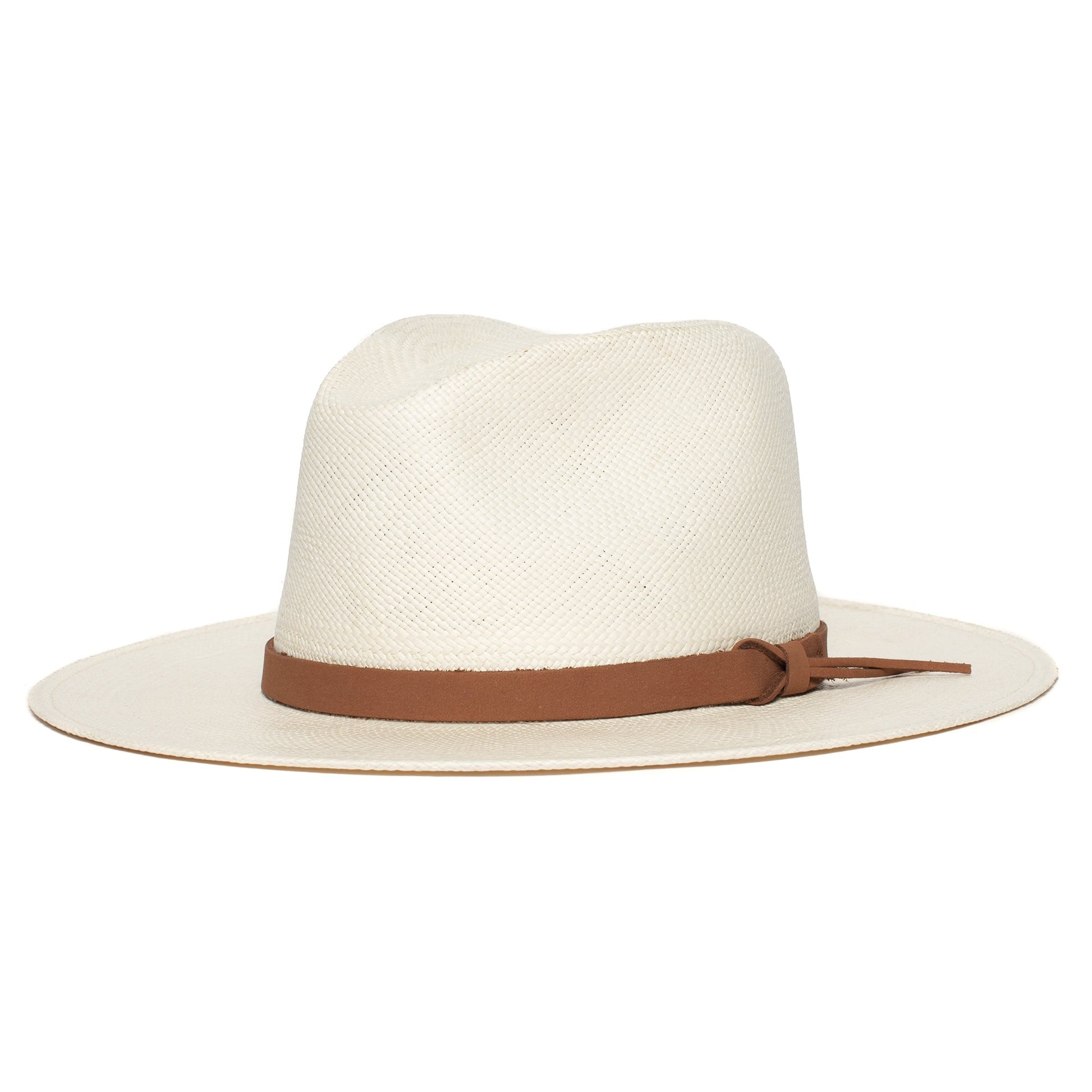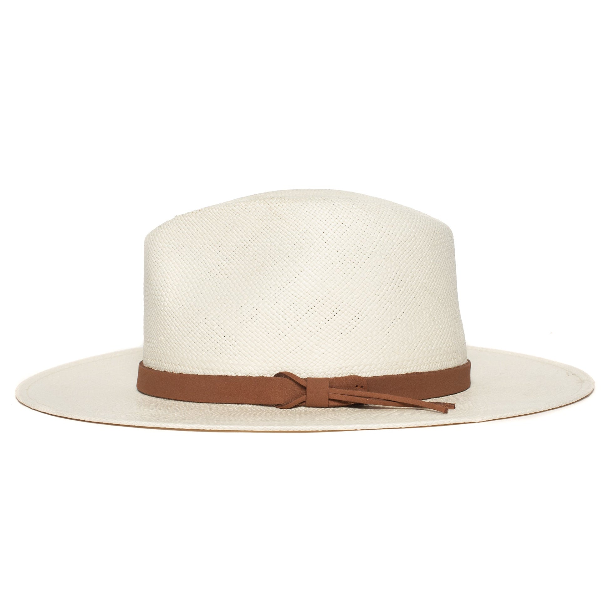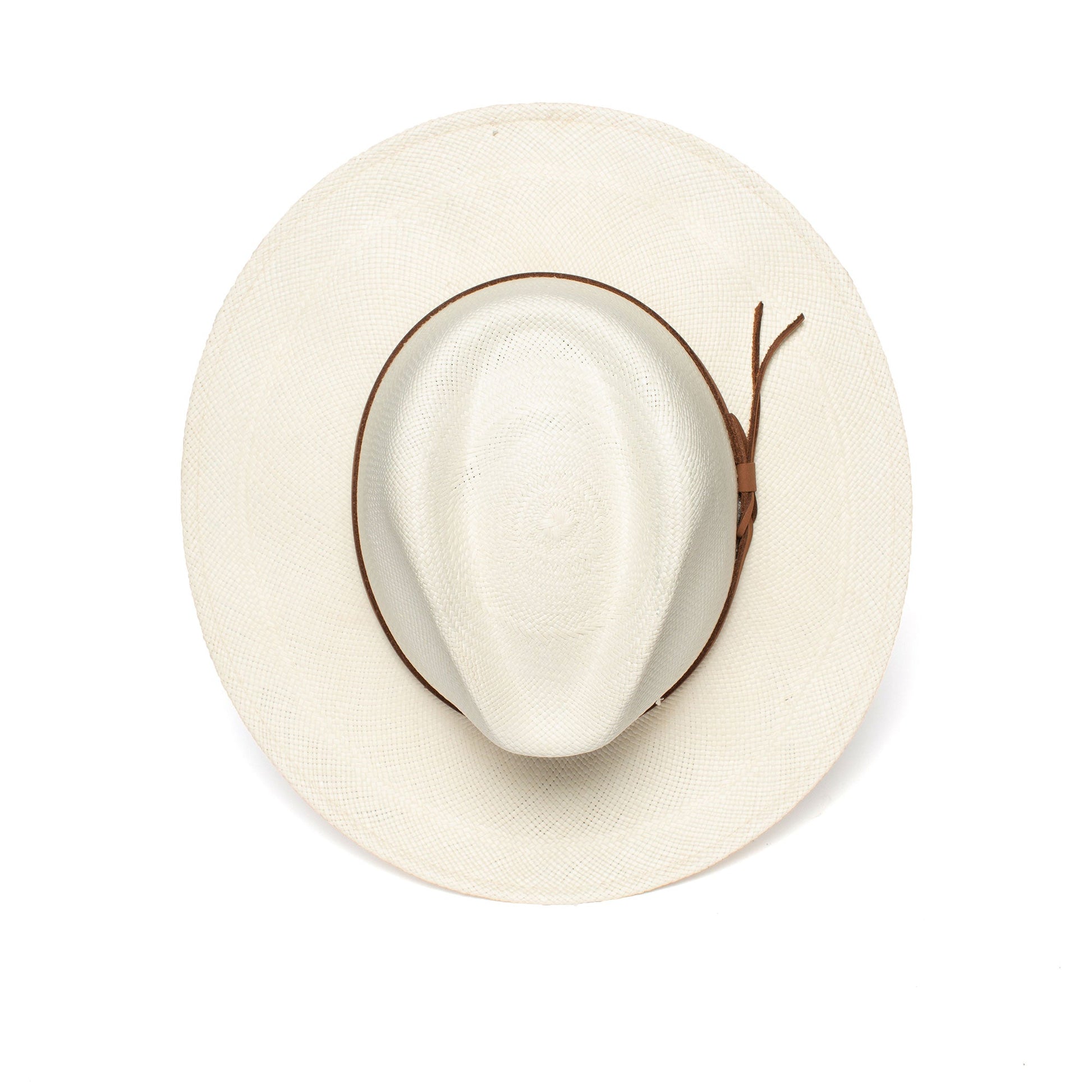This Panama hat features a 3" center dent crown, 3" flat stiff brim, a leather hat band with hand tied knot and tails, and a German wicking sweatband.