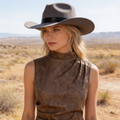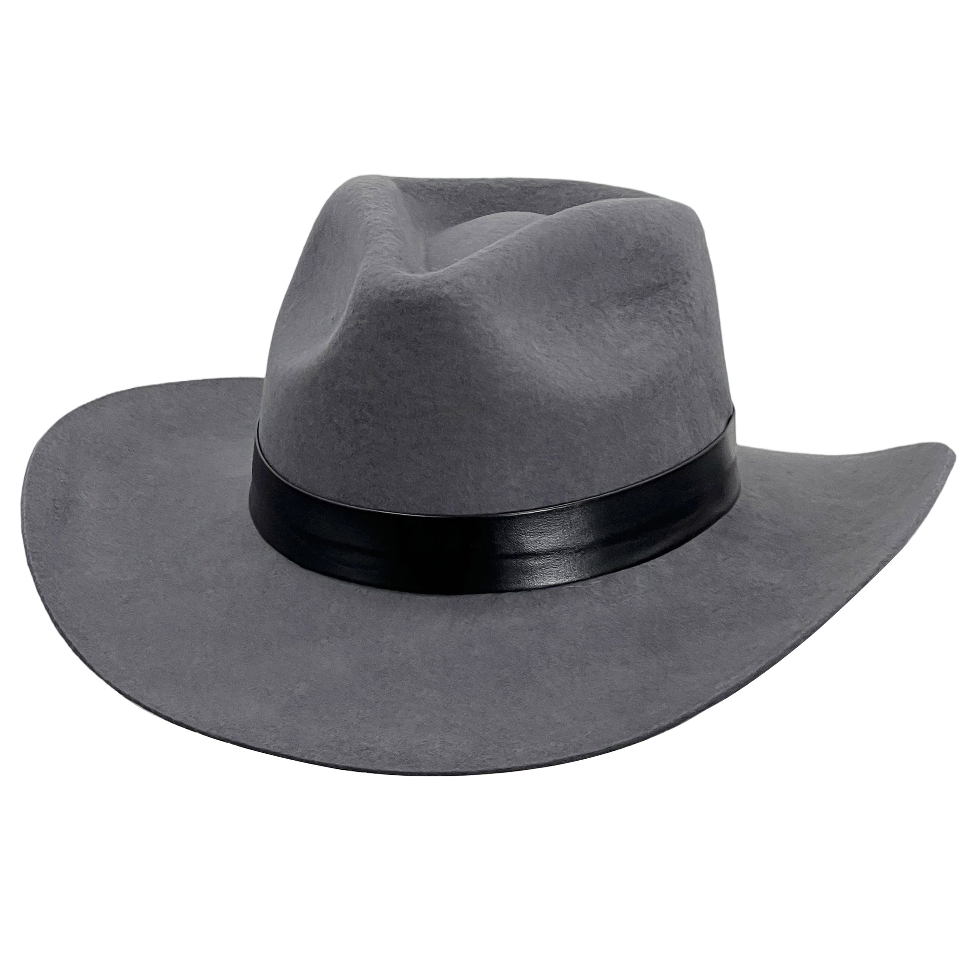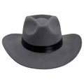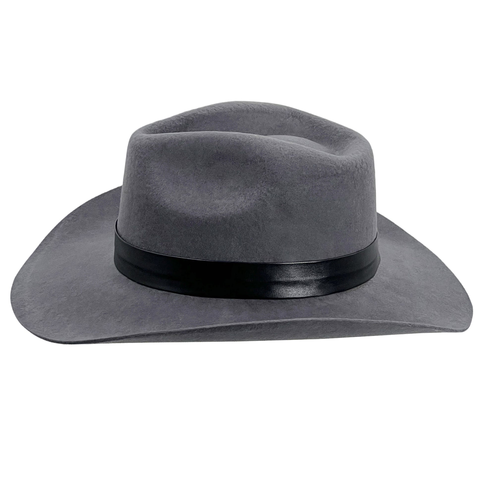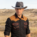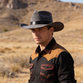 The Westbound is a clean and commanding hat crafted from premium felt, shaped with a sharp teardrop pinch and a bold 3¼" western brim. Wrapped in custom-embossed black leather and textured black fabric, it brings a rugged edge with refined detail. Handmade and trail-ready, it’s built for those who ride between grit and style.