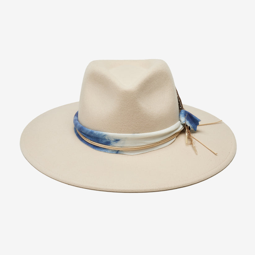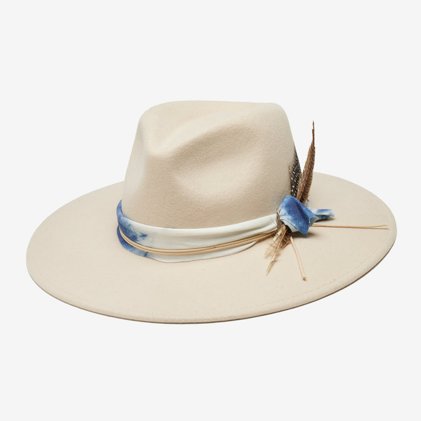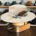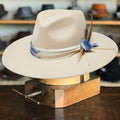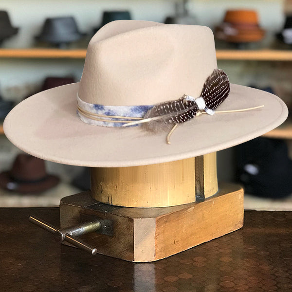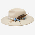 The Woolen Whisper in Oatmeal is constructed of firm finish, fur felt and features a pinchfront crown, bound edge brim, hat band with feather accent.