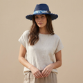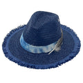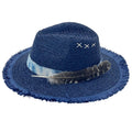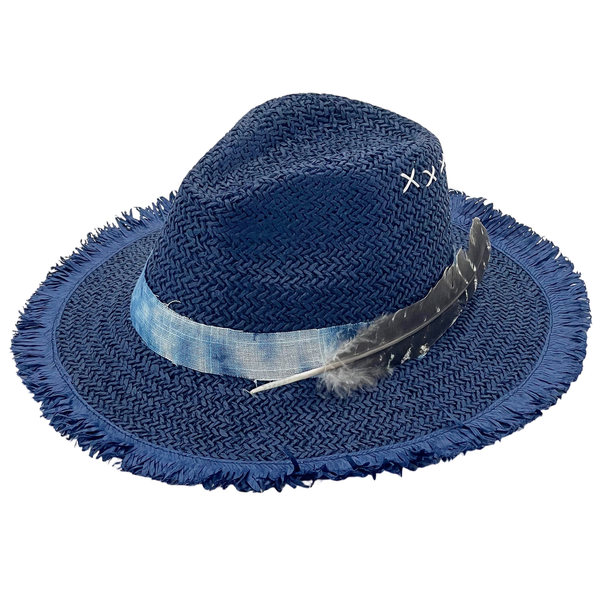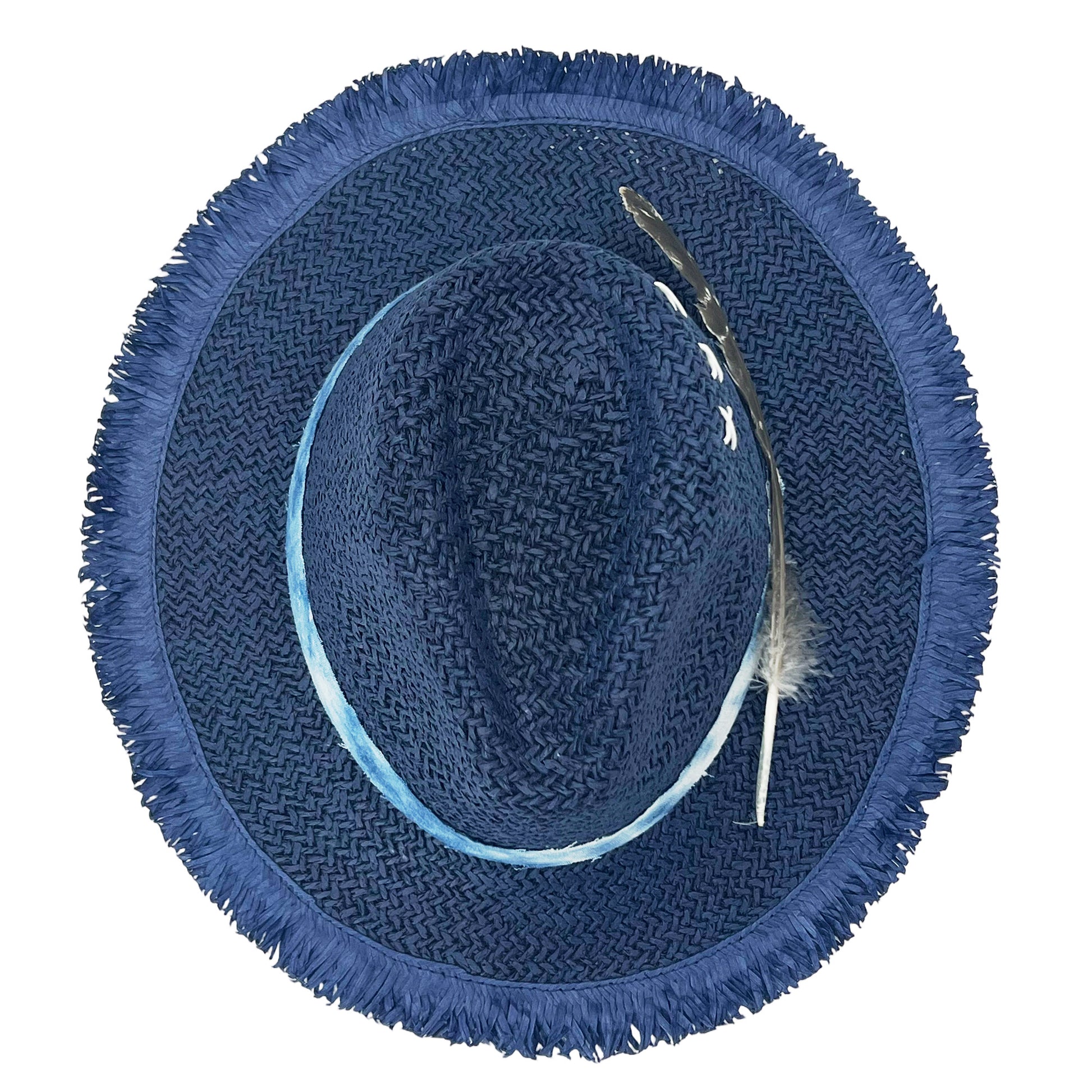 A refined handwoven straw hat in rich blue, blending artisanal texture with contemporary summer style. The hatband features custom tie-dye fabric paired with a feather—adding subtle movement and tonal depth while preserving a clean, effortless silhouette. The crown stands approximately 4¼" tall, with an 8cm (3⅛") brim—hand-measured, with a possible variance of up to ¾" (1–2 cm). Perfect for coastal days, city strolls, or warm-weather elegance with character.